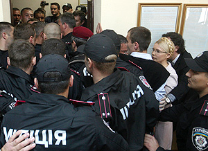 Сторонники арестованной в считанные минуты заблокировали Крещатик, чтобы не дать проехать автозаку, в который поместили Тимошенко при помощи "беркутовцев", растолкавших толпу поклонников подсудимой. Тем не менее, машина, окруженная кольцом сотрудников правоохранительных органов, медленно выехала на главную улицу Киева и направилась к СИЗО.