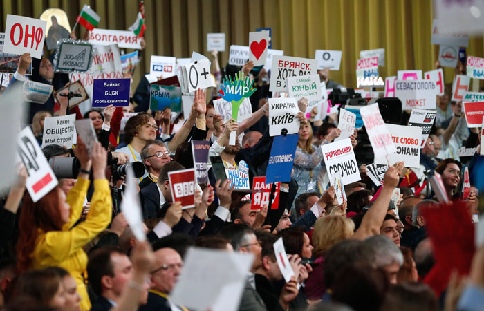 15-я ежегодная пресс-конференция президента РФ проходит в Центре международной торговли в Москве.