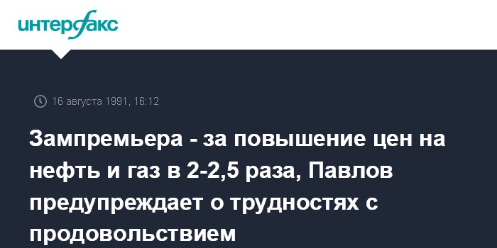 Москва. 16 августа. ИНТЕРФАКС. Заместитель премьер-министра СССР Лев Рябев на заседании Кабинета министров заявил, что цены на газ и нефть должны быть повышены в 2 и 2,5 раза соответственно. Он сказал, что стоимость бензина тоже возрастет. По словам Л.Рябева, в стране сложилась непростая ситуация с обеспечением электростанций необходимым топливным сырьем.