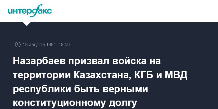 Алма-Ата. 19 августа. ИНТЕРФАКС. Президент Казахстана Нурсултан Назарбаев в обращении к народу заявил, что чрезвычайного положения на территории республики введено не будет. Он призвал войска, дислоцированные на территории Казахстана, органы КГБ, МВД "быть верными конституционному долгу, уважать права личности, подчиняться местным органам власти".