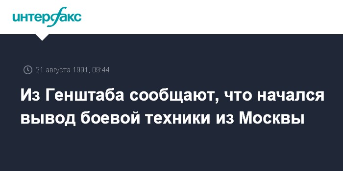 Москва. 21 августа. ИНТЕРФАКС. Начался вывод боевой техники из Москвы. Сегодня утром, по свидетельству очевидцев, уже не было танков возле Кремля.