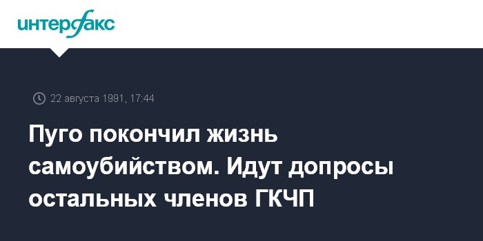 Москва. 22 августа. ИНТЕРФАКС. Представитель правоохранительных органов РСФСР на чрезвычайной сессии парламента России сообщил, что министр внутренних дел СССР Борис Пуго покончил жизнь самоубийством при его аресте утром в четверг. Его жена, которая попыталась последовать его примеру, получила тяжелое ранение.