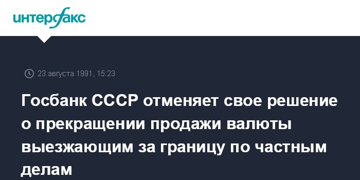 Москва. 23 августа. ИНТЕРФАКС. 24 августа Госбанк СССР отменил свое решение от 21 августа, согласно которому была временно прекращена продажа валюты гражданам, выезжающим за рубеж по частным делам.