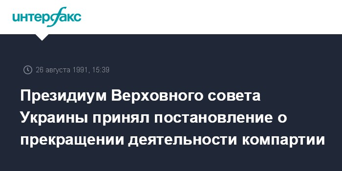 Киев. 26 августа. ИНТЕРФАКС. Президиум Верховного Совета Украины принял постановление о прекращении деятельности компартии Украины на территории республики. Это вызвано тем, что обнаружены документы о прямой причастности руководства компартии Украины к организации и поддержке организаторов государственного переворота.