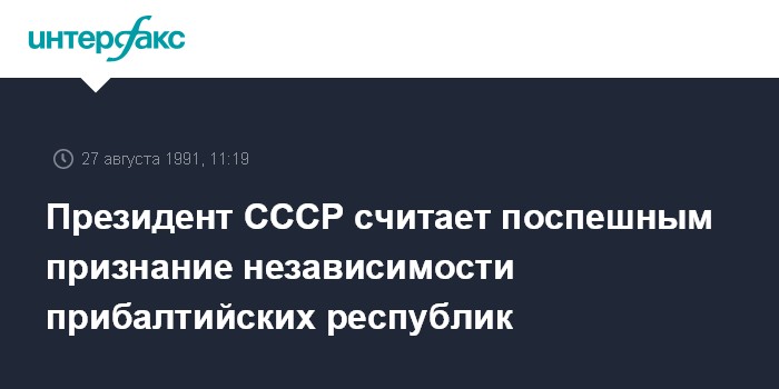 Москва. 27 августа. ИНТЕРФАКС. Президент СССР Михаил Горбачев, отвечая на просьбу журналистов прокомментировать факт признания государственности прибалтийских республик Данией, Норвегией, Швецией и рядом других стран, заявил, что "все слишком спешат. Спешат и одна, и другая стороны".