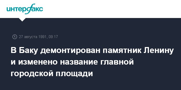 Баку. 27 августа. ИНТЕРФАКС. В ночь на 27 августа на главной площади Баку - площади Ленина демонтирован памятник "вождю мирового пролетариата".