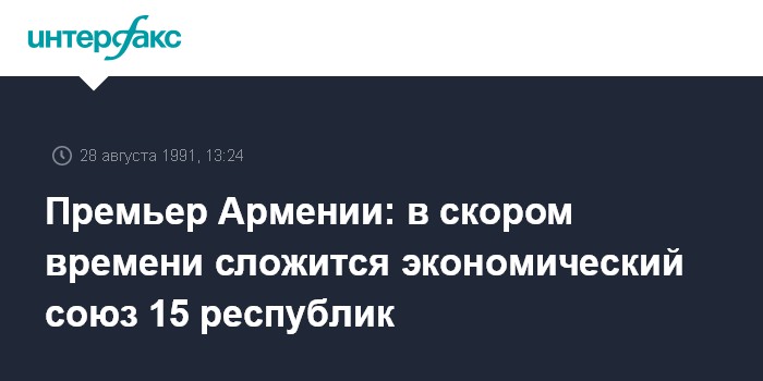 Ереван. 28 августа. ИНТЕРФАКС. Премьер-министр Армении Вазген Манукян в интервью республиканскому телевидению высказал мнение, что в скором времени сложится экономический союз 15 республик.