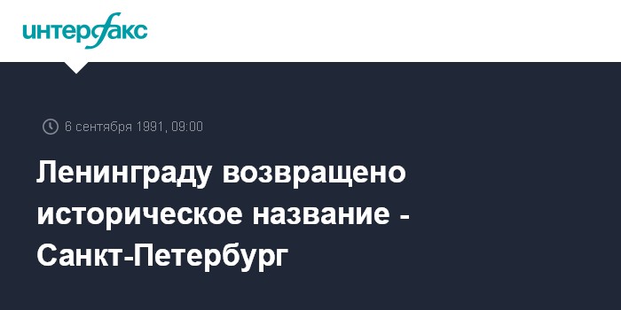 Санкт-Петербург. 6 сентября. ИНТЕРФАКС. Ленинграду возвращено его историческое название Санкт-Петербург.