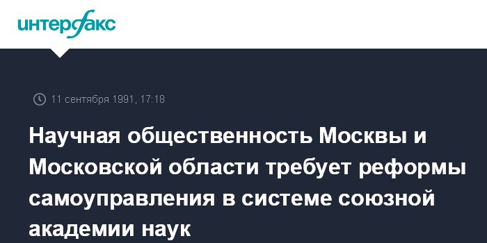 Он сообщил, что 13 сентября в Физическом институте Академии наук СССР /ФИАН/ в 17 часов состоится конференция представителей академических институтов. Требования инициативной группы по созыву конференции: отставка президиума и правления АН СССР, созыв съезда ученых для решения вопроса о переходе под юрисдикцию РСФСР, замена общего собрания АН временным комитетом по самоуправлению.