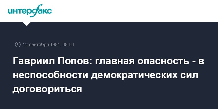 Попов сказал, что реакционные силы в стране по-прежнему представляют угрозу, пока сохраняется всеобщая государственная собственность и связанные с ней структуры. "Но главная опасность исходит сейчас не от них. Она заключается в том, что демократические силы до сих пор неспособны договориться между собой", - подчеркнул мэр Москвы.