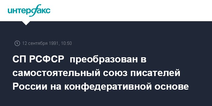 Москва. 12 сентября. ИНТЕРФАКС. Начавшийся в четверг в московском кинотеатре "Горизонт" чрезвычайный съезд писателей Российской Федерации принял решение преобразовать Союз писателей РСФСР в самостоятельный суверенный Союз писателей России.