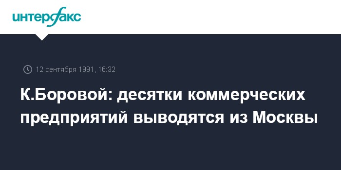 Москва. 12 сентября. ИНТЕРФАКС. Главный управляющий Российской товарно-сырьевой биржи Константин Боровой сообщил 12 сентября, что, начиная с 30 августа, из Москвы выводятся "десятки коммерческих предприятий". Эта акция, по словам К.Борового, проводится Московской конвенцией предпринимателей в знак протеста против решения российских властей оказать административное воздействие на деятельность рыночных структур.
