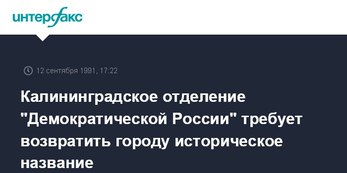 Калининград. 12 сентября. ИНТЕРФАКС. В минувшую среду вечером на площади Победы в Калининграде (областной центр на западе РСФСР) прошел санкционированный властями митинг. Принявшие в нем участие около 200 активистов местного отделения движения "Демократическая Россия" и Союза аграриев Калининградской области потребовали вернуть городу историческое название - Кенигсберг, ухода в отставку председателя областного совета, проведения в области земельной реформы.