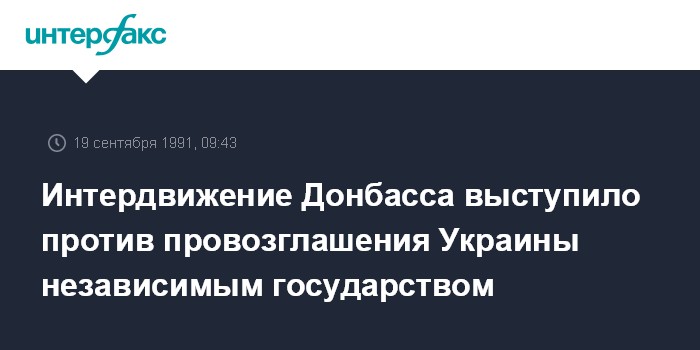 Москва. 19 сентября. ИНТЕРФАКС. Интердвижение Донбасса расценило провозглашение Украины независимым государством как неконституционный акт. Оно призвало к проведению в Донбассе регионального референдума относительно предоставления ему статуса автономии.