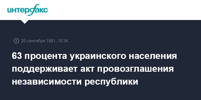 Киев. 25 сентября. ИНТЕРФАКС. 63 процента населения Украины поддерживают акт провозглашения республики независимым государством. Против высказались 17,3 процента. Об этом свидетельствуют результаты опроса, проведенного Институтом социологии Академии наук Украины.