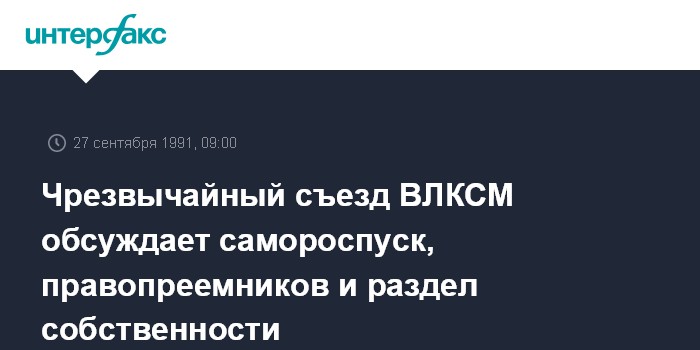 Москва. 27 сентября. ИНТЕРФАКС. В повестке дня 22-го чрезвычайного съезда ВЛКСМ, открывшегося в пятницу в Москве - вопросы о роспуске этой организации, о правопреемниках и о разделе собственности.