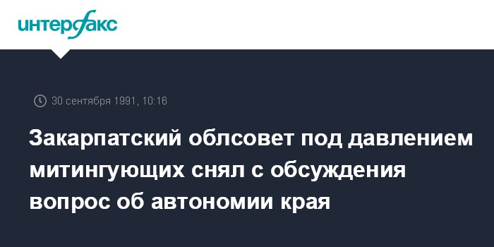 Ужгород. 30 сентября. ИНТЕРФАКС. Закарпатский облсовет под давлением нескольких тысяч митингующих снял с повестки дня вопрос об образовании автономии Закарпатского края.