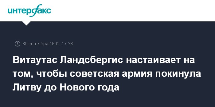 Вильнюс. 30 сентября. ИНТЕРФАКС. Глава литовского парламента Витаутас Ландсбергис считает, что основной контингент советских войск до Нового года должен покинуть Литву.