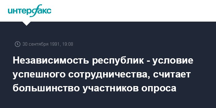 Москва. 30 сентября. ИНТЕРФАКС. 45% населения страны убеждены, что обретение республиками бывшего Союза государственной независимости станет основой для развития их сотрудничества, сообщает агентство "Дата". Об этом свидетельствуют данные опроса, проведенного в сентябре Всесоюзным центром изучения общественного мнения среди 2075 респондентов по всесоюзной выборке.