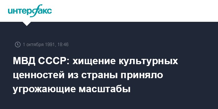 Общая цифра культурных ценностей за 1991 год, похищенных в СССР, оценивается в 1 млн. 172 тыс. руб. Из них обращено в доход государству - 387 тыс. руб. По словам генерала-майора милиции, заместителя начальника Главного управления уголовного розыска МВД СССР Александра Котлярова, три четверти культурных ценностей похищается у частных коллекционеров, так как их коллекции, их имущество слабо охраняются.