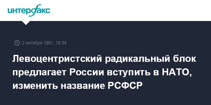 Москва. 2 октября. ИНТЕРФАКС. В среду в Москве состоялось совместное внеочередное заседание Регентского совета Российской монархии, представителей Русской национальной партии и левоцентристского радикального блока политических партий и движений. Его участники призвали президента и парламент РСФСР рассмотреть вопрос о вступлении Российской Федерации в НАТО.