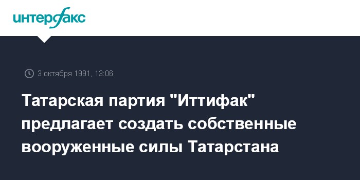 Казань. 3 октября. ИНТЕРФАКС. Татарская партия национальной независимости "Иттифак" выступила с политическим заявлением, в котором требует немедленно прекратить осенний призыв в армию на территории Татарстана и издать указ, закрепляющий право граждан республики служить только в ее пределах.