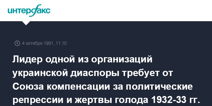 Киев. 4 октября. ИНТЕРФАКС. Украина должна потребовать от Союза компенсацию за жертвы во время искусственного голода 1932-33 годов, когда погибли около 10 млн. человек, за репрессии и массовые уничтожения мирного населения. Об этом заявил в пятницу на пресс-конференции в Киеве глава Всемирного конгресса свободных украинцев (ВКСУ) Юрий Шимко.