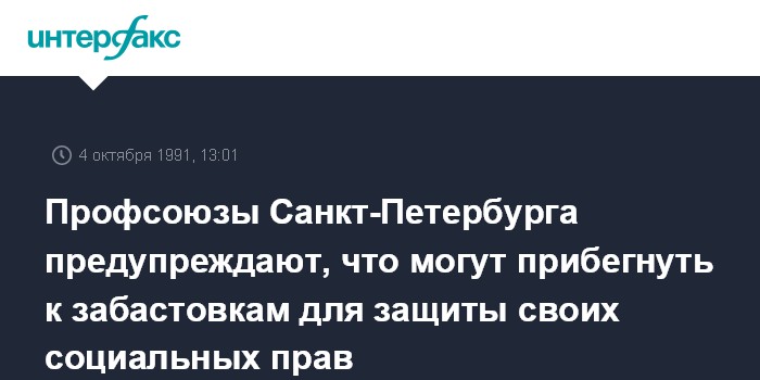 Санкт-Петербург. 4 октября. ИНТЕРФАКС. Руководство профсоюзов Санкт-Петербурга призвало президента и парламент России принять срочные меры для стабилизации экономической ситуации и социальной защиты населения в условиях перехода к рыночной экономике. В противном случае трудящиеся будут поставлены перед необходимостью прибегнуть к коллективным действиям.
