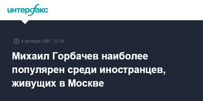Москва. 4 октября. ИНТЕРФАКС. Иностранцы, живущие в Москве, отдают предпочтение президенту СССР Михаилу Горбачеву. 76 % респондентов назвали Горбачева самым популярным советским политиком, свидетельствует телефонный опрос, проведенный в сентябре американскими компаниями PBN и GLS Research.