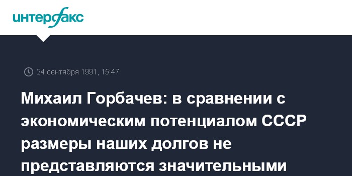 Горбачев: Мы считаем, что масштабы природных ресурсов СССР, потенциал подготовленного образованного населения, льготные условия для иностранных инвесторов создают все возможности, чтобы мощным рывком двинуть вперед экономику, интегрировать ее в мировой хозяйственный обиход, это даст быструю и эффективную отдачу. Возрастет экспорт, будут погашены долги. Кстати, в сравнении с экономическим потенциалом СССР, размеры наших долгов вовсе не представляются столь уж значительными. Нам надо с вами запустить экономический механизм на полные обороты, и тогда тема о долгах умрет сама собой.