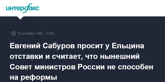 Москва. 13 октября. ИНТЕРФАКС. Евгений Сабуров, подавший на днях в отставку с поста заместителя председателя Совета министров РСФСР, заявил в письме на имя президента России Бориса Ельцина, что Совмин в нынешнем своем составе и при данных полномочиях и организации работы "не способен проводить реформаторские действия".