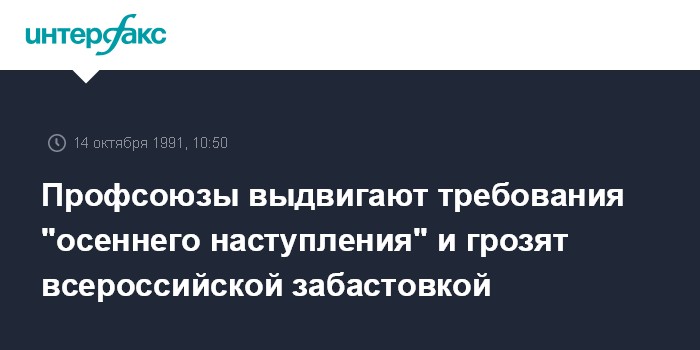 В случае невыполнения требований ФНПР грозит "обсудить возможность проведения 13 ноября Всероссийской акции протеста в виде одночасовой приостановки работы предприятий, за исключением объектов жизнеобеспечения и предприятий непрерывного цикла работы".
