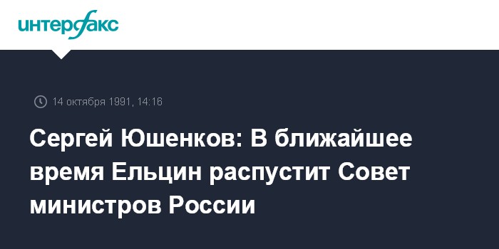 Москва. 14 октября. ИНТЕРФАКС. В ближайшее время Президент РСФСР Борис Ельцин подпишет указ об отставке всего состава Совета Министров. Об этом заявил в интервью корреспонденту "Интерфакса" лидер парламентской фракции "Радикальные демократы" Сергей Юшенков.