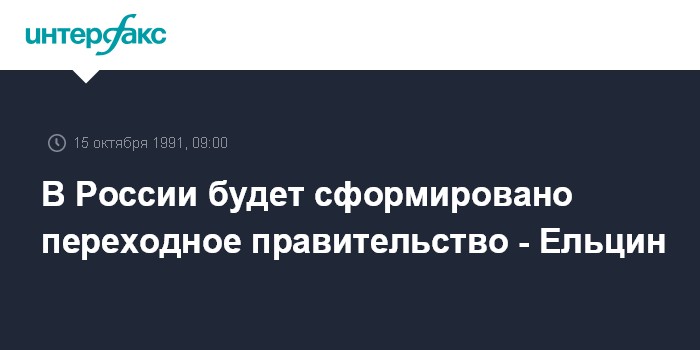 Москва. 15 октября. ИНТЕРФАКС. Президент РСФСР Борис Ельцин заявил, что в ближайшее время в России будет сформировано переходное правительство, исполняющий обязанности премьер-министра которого будет назначен указом президента. В интервью российскому телевидению он сообщил, что рассмотрел три кандидатуры, исключив при этом вице-президента Александра Руцкого.