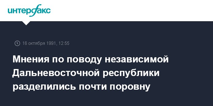 Владивосток. 16 октября. ИНТЕРФАКС. Дальневосточное отделение Всесоюзного центра по изучению общественного мнения распространило результаты репрезентативного опроса населения в ряде краев и областей Дальнего Востока об отношении к идее создания политически и экономически независимой Дальневосточной республики.