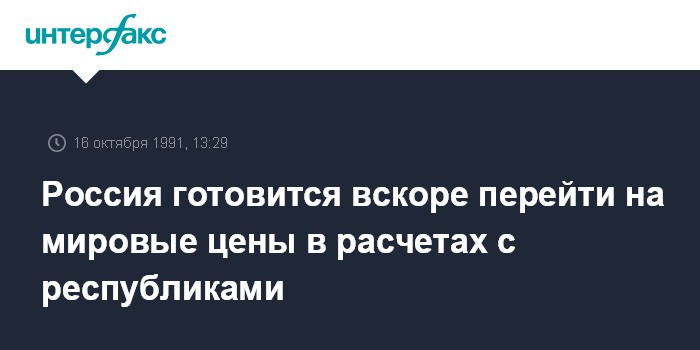 Москва. 16 октября. ИНТЕРФАКС. Президент России Борис Ельцин сообщил, что, возможно, с 1 ноября, взаимные расчеты России с бывшими союзными республиками будут вестись по мировым ценам. Об этом говорилось в среду на встрече президента с руководителями комитетов и комиссий Верховного Совета России, сообщил "Интерфаксу" народный депутат РСФСР Николай Медведев.