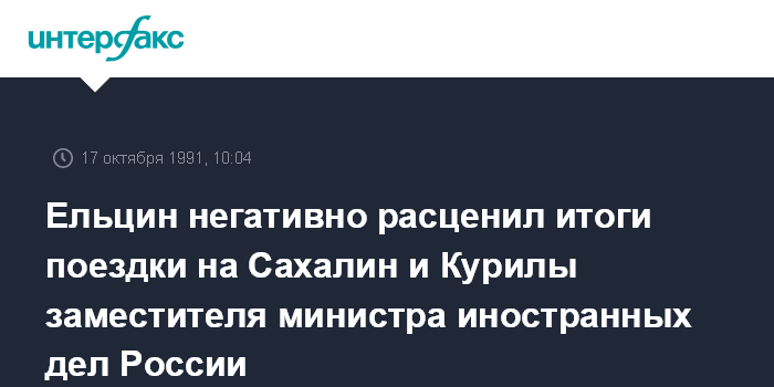 Москва. 17 октября. ИНТЕРФАКС. Президент РСФСР Борис Ельцин на встрече с представителями Совета фракций российского парламента в четверг негативно расценил итоги недавней поездки на Сахалин и Курильские острова заместителя министра иностранных дел России Георгия Кунадзе. Об этом сообщил журналистам после встречи народный депутат РСФСР Сергей Бабурин.