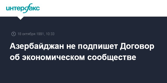 Баку. 18 октября. ИНТЕРФАКС. Азербайджанский парламент принял решение, согласно которому республика не будет подписывать Договор об экономическом сообществе. Против подписания Договора проголосовали 174 депутата. "За" были лишь 35 депутатов. 24 воздержались, а 7 в голосовании не участвовали.
