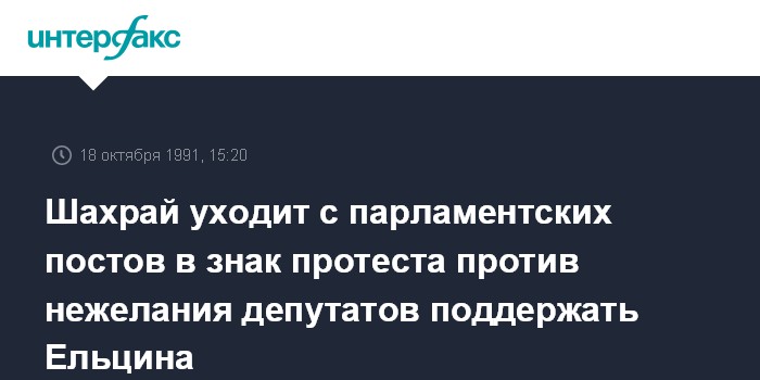 Москва. 18 октября. ИНТЕРФАКС. Сергей Шахрай заявил на заседании российского парламента о своем уходе с постов члена Президиума Верховного Совета РСФСР и председателя Комитета по законодательству. Он объяснил это решение вчерашним отказом парламента поддержать просьбу президента Ельцина о переносе выборов глав администрации на более поздний срок.