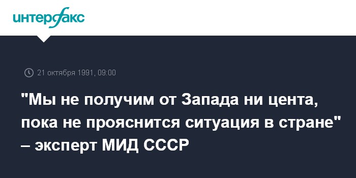Москва. 21 октября. ИНТЕРФАКС. "Мы не получим от Запада ни цента, пока не прояснится ситуация в стране", - заявил в интервью "Интерфаксу" один из экспертов Управления международных экономических отношений МИД СССР, только что вернувшийся из Бангкока со встречи "большой семерки" и с сессии МВФ и Всемирного банка. "Нам ясно дали понять, что помощи никакой не будет, пока не будет ясно, с кем иметь дело в СССР", - указал эксперт.