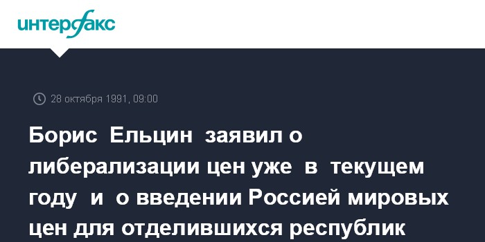 Ельцин сказал, что Россия как основной поставщик сырья в другие республики оказалась в самом невыгодном положении. Ежегодно она несет убытки в 33 млрд. рублей. В связи с этим для всех республик экономического союза будут введены новые цены на сырье.