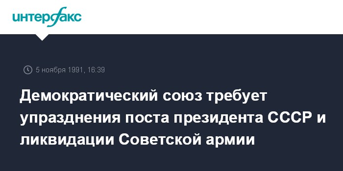 Москва. 5 ноября. ИНТЕРФАКС. Демократический союз потребовал упразднения поста президента СССР, немедленного освобождения политзаключенных, ликвидации советской армии и расформирования военно-промышленного комплекса под международным контролем.