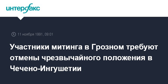 Грозный. 11 ноября. ИНТЕРФАКС. В Грозном продолжается митинг сторонников лидера Общенационального конгресса чеченского народа генерала в отставке Джохара Дудаева. Его участники требуют отмены чрезвычайного положения в Чечено-Ингушетии.