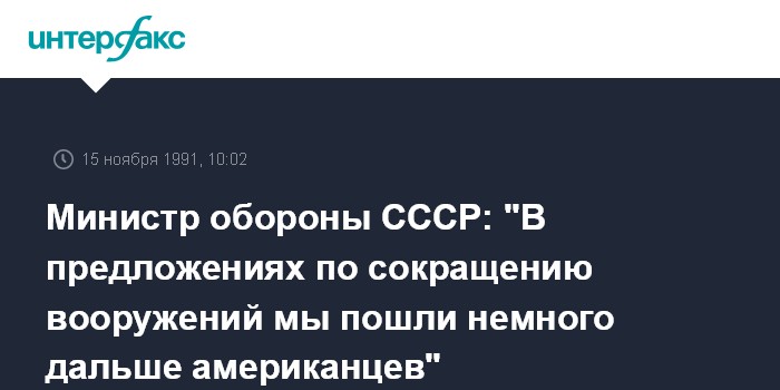 Москва. 15 ноября. ИНТЕРФАКС. "Мы очень внимательно изучили предложения Джорджа Буша по сокращению тактических и стратегических ядерных вооружений и пошли немного дальше американцев", - заявил в эксклюзивном интервью "Интерфаксу" министр обороны СССР Евгений Шапошников.