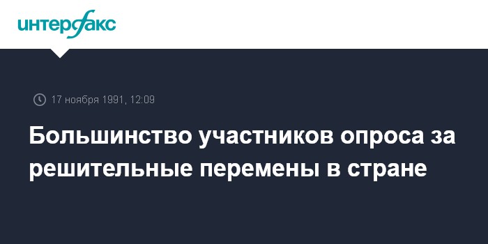 Москва. 17 ноября. ИНТЕРФАКС. В пользу быстрых решительных перемен в стране высказались 56% участников опроса, проведенного в октябре Всесоюзным центром изучения общественного мнения. Опрошено 2053 человек по всесоюзной репрезентативной выборке, сообщает агентство "Дата".