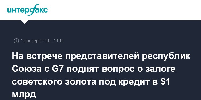 Москва. 20 ноября. ИНТЕРФАКС. Главная проблема, которая обсуждалась в среду на встрече глав правительств 8-ми суверенных республик с заместителями министра финансов семи наиболее развитых стран - это вопрос о залоге 104 тонн из золотого запаса СССР под кредит в 1 млрд долл. со стороны Запада для покрытия срочных платежей Союза зарубежным кредиторам. Об этом заявил участвующий в переговорах постоянный представитель правительства Беларуси Виктор Даниленко в интервью "Интерфаксу".