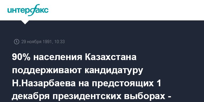 Алма-Ата. 29 ноября. ИНТЕРФАКС. 90% населения Казахстана поддерживают кандидатуру Нурсултана Назарбаева на предстоящих 1 декабря президентских выборах в республике.