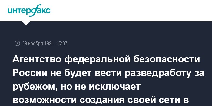 Москва. 29 ноября. ИНТЕРФАКС. Генеральный директор Агентства федеральной безопасности РСФСР (АФБ) Виктор Иваненко не исключил возможности создания в некоторых республиках бывшего СССР своей разведсети, если "мы придем к выводу, что там назревает серьезная угроза национальным интересам России".