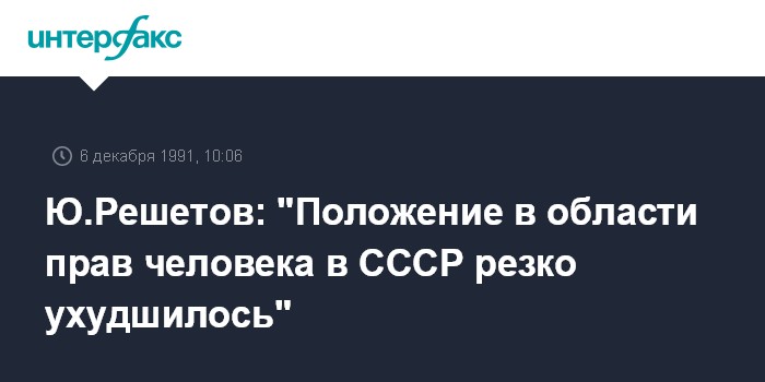 Москва. 6 декабря. ИНТЕРФАКС. Положение в области прав человека в СССР за последние месяцы резко ухудшилось. Об этом заявил сегодня (6 декабря) начальник Управления по международному гуманитарному сотрудничеству и правам человека МВС СССР Юрий Решетов, выступая на пресс-конференции по случаю Международного дня прав человека.