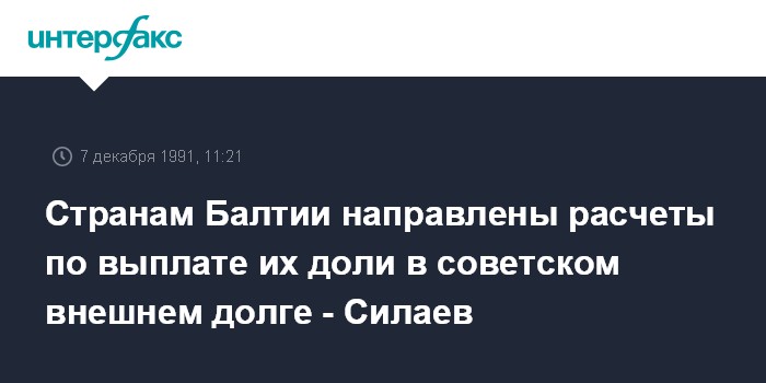 Расчеты по этой части долга уже отправлены в Прибалтику, сказал он, выступая в субботу на брифинге в Москве. Отвечая на вопрос корреспондента "Интерфакса", И.Силаев подтвердил, что прибалтийские республики уже выразили принципиальное согласие выплачивать свою долю долга - "вопрос лишь в методах расчета". Он выразил надежду, что взаимоприемлемое решение будет найдено.